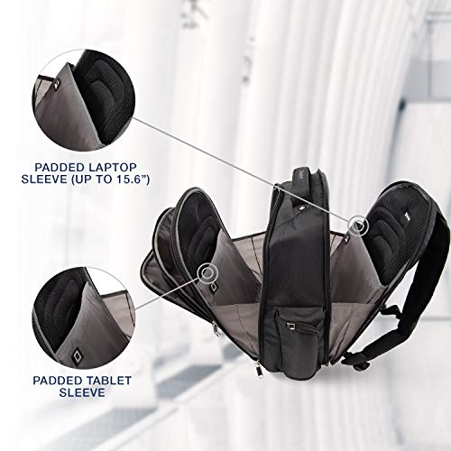 Padded laptop (up to 15.6”) and tablet sleeves offer protection for electronics. Dual access to laptop and main compartment provides complete versatility when packing or accessing essentials