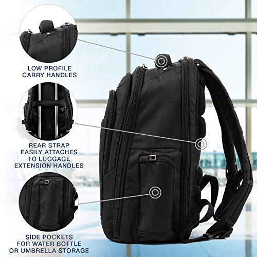 Adjustable sternum straps help redistribute load weight. Breathable, padded-back design and padded shoulders straps provide ultimate, fatigue-free comfort. Unobtrusive rear strap fits around the extension handle of a Rollaboard or spinner suitcase for secure stacking and hands-free mobility