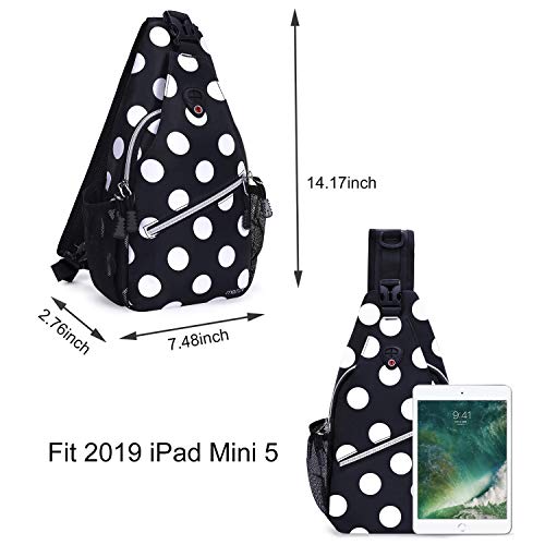 Dimension: 14.17 x 7.48 x 2.76 inches (L x W x H). Main compartment is compatible with iPad Mini 5 2019, iPad Mini 4/2, Kindle Paperwhite and other 6-9 inch tablet and e-reader. Other multifunctional pockets can store phones, wallet or outdoor/travel sundries. 2 side mesh pockets for water bottle (up to largest diameter 2.5 inch) and umbrella. 1 hidden zippered pocket on the back is convenient for your precious items.