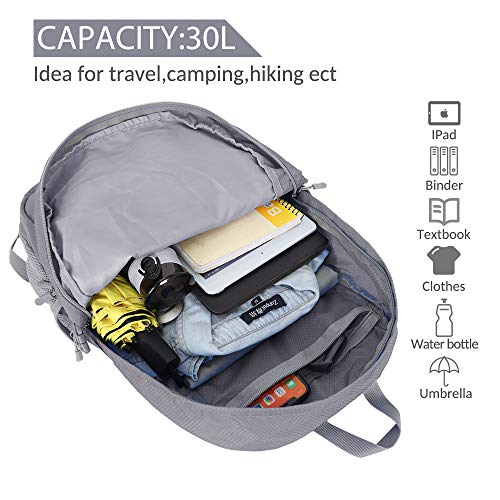 ROOMY SPACE – Designed with 30L travel capacity yet foldable, this backpack is suitable for day trip. One main zipped compartment, two front pocket and two side pockets keep your things organized and separated