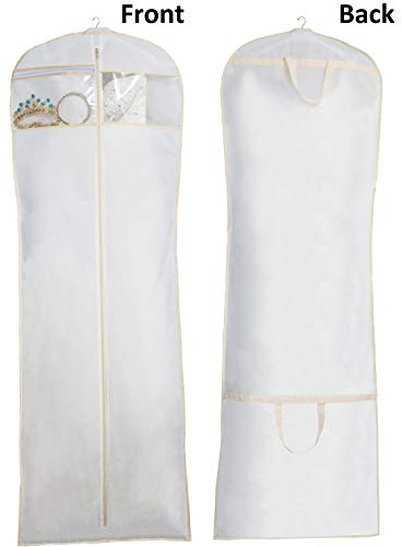 A zipper pocket for holds jewelry accessories, wedding veil,collar and pins ect, clear pvc window to view in without having to unzip the whole bridal gown garment bag;