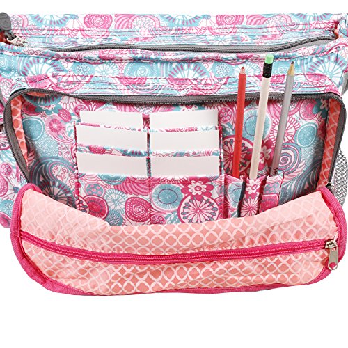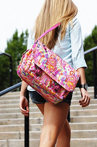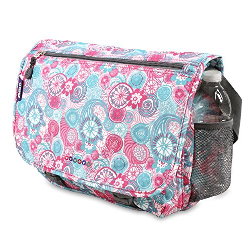 J world new york terry messenger bag comes in a variety of prints that will allow you to keep all of the belongings you need while looking very fashion forward. The terry model comes with an adjustable shoulder strap that attaches to both sides. The front opens up with a double release buckle and for the main compartment there is a zipper closure. The front pocket is an organizer that fits your pens, pencils and credit cards.