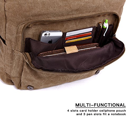 PRACTICAL DESIGN: Vintage canvas fabric with high quality vegan leather belt buckles and zippers. Designed with multiple storage compartments and slots: exterior Front wall zipper compartment/exterior Back wall zipper compartment/interior top open pouches/interior back wall zipper pocket. Very roomy to keep all your stuff organised