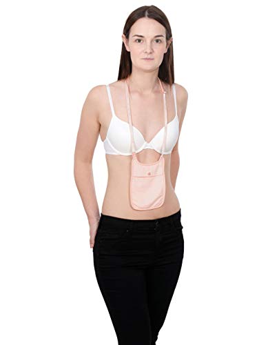 Discreet, hidden, and soft-to-the-touch secret neck pouch made from lingerie fabric; fits passport, credit cards, and cash