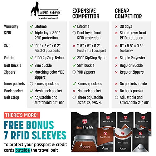 Money Belt for Travel – RFID Money belt for Travel (size: 10 x 5.2 x 0.2 with long adjustable elastic strep), Comes with a set of Six RFID blocking sleeves for Credit Cards and One for Passport, Great for Daily Use