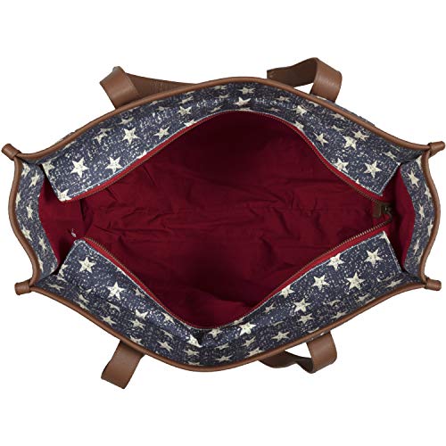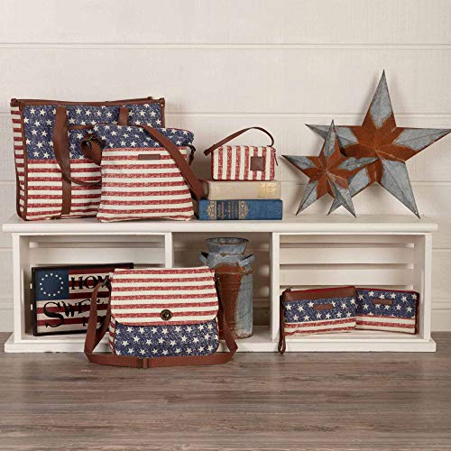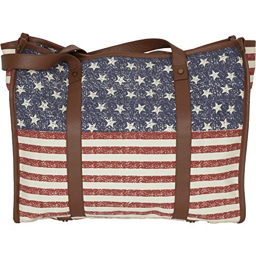 PATRIOTIC AMERICANA DESIGN: Deep red, soft creme, and navy stars and stripes cover this canvas bag with American pride. The distressed feature of the canvas print adds a touch of rustic charm.