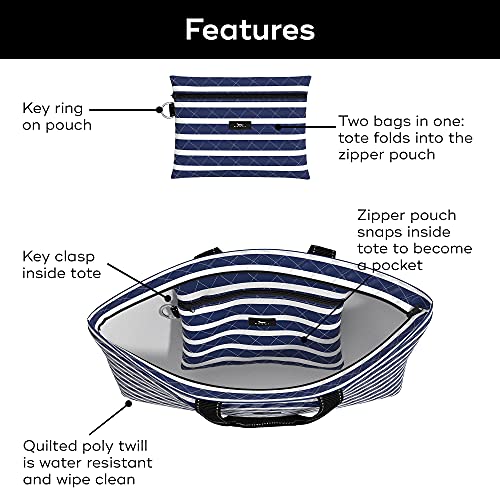 THIS POUCH TURNS INTO A TOTE. The soft, quilted tote bag folds into a removable zipper pouch that transforms into a snap-in pocket.