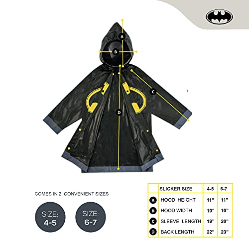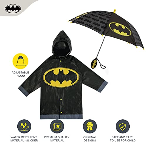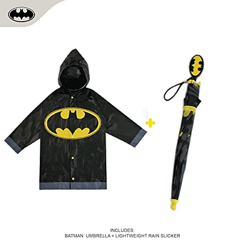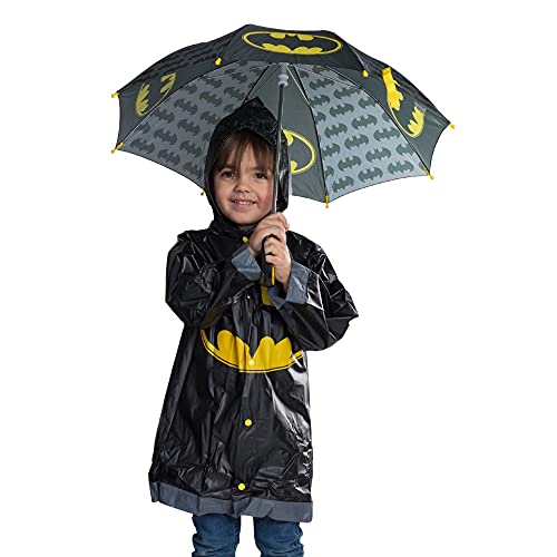PLAYFUL DESIGNS: Help him be a Rainy-day hero with these adorable and Lightweight Umbrella and matching Slicker set featuring imagery of his favorite Characters Batman or Superman from DC Comics. Designed to Fit for Toddlers and Little Boys, and available in different sizes for ages 2-7, The Rain Slicker is moisture and humidity resistant.