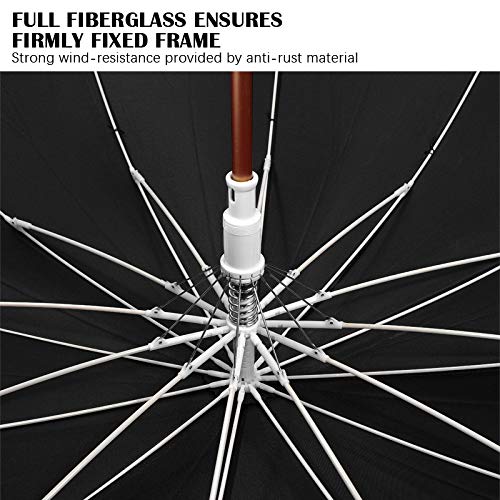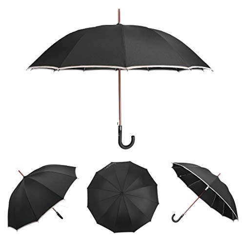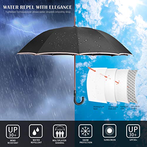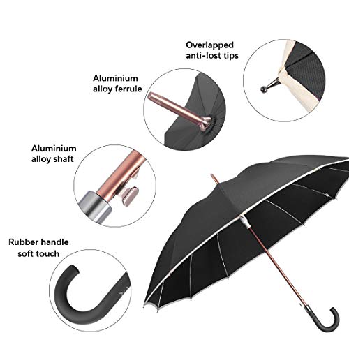 QUICK DRYING & ERGONOMIC HANDLE: The canopy is made from high-density fabric. It has a water-repelling Teflon coating which allows water to drip easily and shake right off to help you stay dry consistently. The shape of the handle is like J which makes people much easier to hold. The rubber handle is made of eco-friendly plastic which enhance the sense of touch.