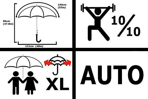 3) AUTOMATIC MECHANISM – This umbrella opens automatically so you can react to a downpour in seconds. The great thing about an automatic mechanism is that you can open the umbrella with just one hand, very important when every second counts and you’re carrying half a dozen shopping bags! When closed, the umbrella measures 38 inches from tip to handle.