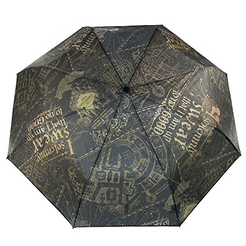 Full size, 42”, auto open umbrella features all over print of Marauder’s Map from Harry Potter. The handle has a sleek grip, a hook. hole, and a wrist strap. Umbrella has a push button open, manual closure, a cover, and an extra strong frame.