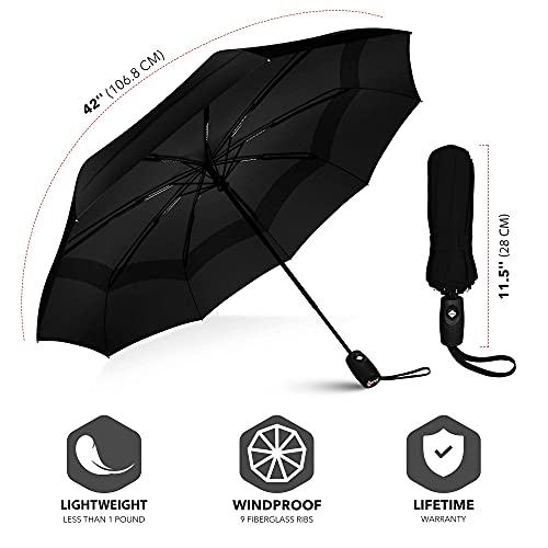 ☔ 9 Rib, Double Vented Windproof Canopy: Our black umbrella features 9 resin reinforced fiberglass ribs that withstand the strongest gusts of wind and are designed to give, not break, preserving your umbrella should you face extreme conditions. The canopy on our small umbrella is double vented, which lets wind pass through while keeping you dry
