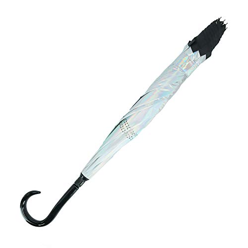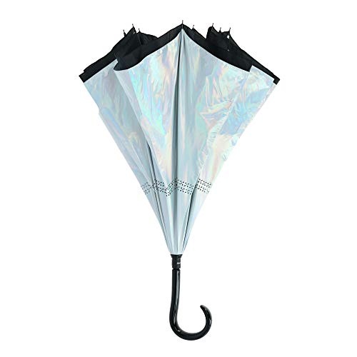 This reversible umbrella has a fashionable iridescent interior canopy that shines when the umbrella is folded. The inverted canopy feature makes it easier and more convenient when getting in and out of the car or house. It can also be propped up to stand on its own to dry.