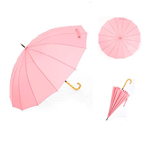 ThreeH Bamboo Stick Umbrella Auto Open Solid Color Fashionable and Simple 190T 16 Ribs,KS08 Pink